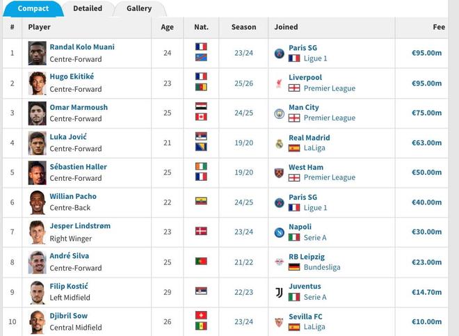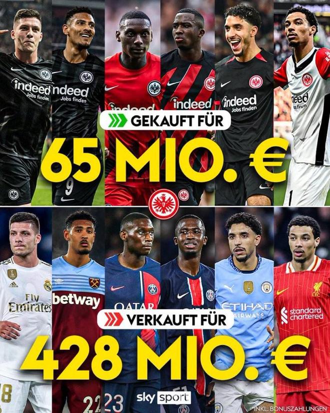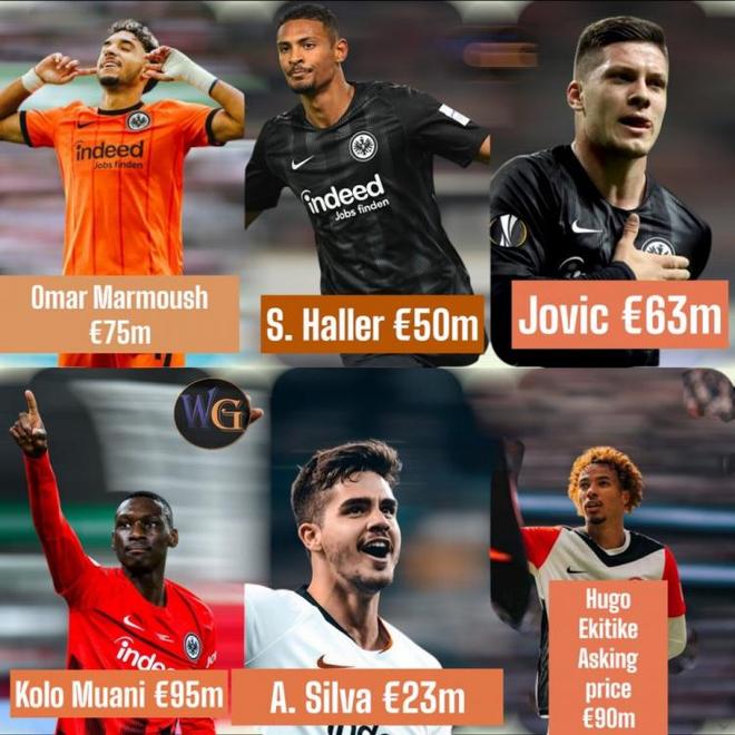 法蘭克福歷史轉會榜:?;倏?、穆阿尼并列第一,9500萬歐